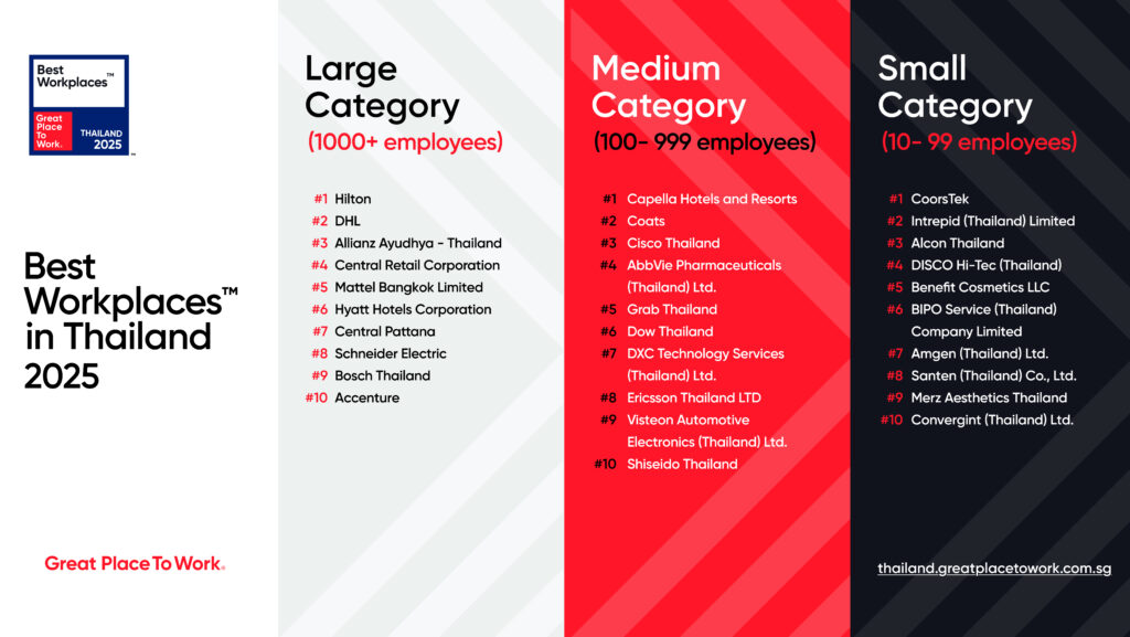 กรุงเทพฯ ประเทศไทย – 13 พฤศจิกายน 2025 – Great Place To Work® องค์กรชั้นนำระดับโลกด้านวัฒนธรรมองค์กร เผยรายชื่อ Best Workplaces™ in Thailand 2025 อย่างเป็นทางการภายในงานแถลงข่าวและพิธีมอบรางวัลสุดยิ่งใหญ่ ณ โรงแรม Millennium Hilton Bangkok เพื่อเฉลิมฉลองให้องค์กรที่เป็นแบบอย่างแห่งความไว้วางใจ ความเท่าเทียม และภาวะผู้นำที่ให้ความสำคัญกับ “คน” ในการขับเคลื่อนการเปลี่ยนแปลงในทุกอุตสาหกรรม