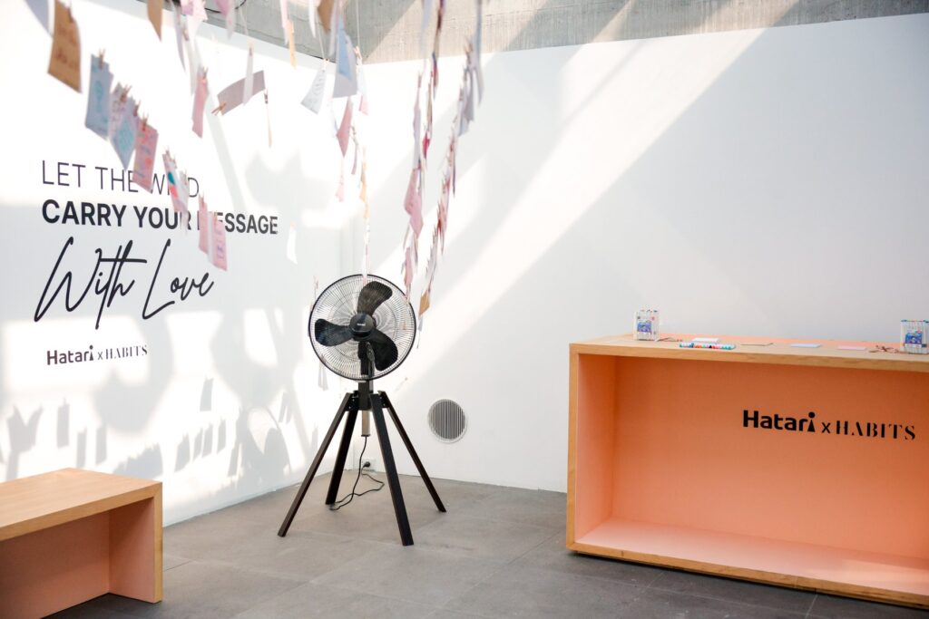 จนิทรรศการ “Love Is in the Air” ชวนทุกคนตั้งคำถามว่า “การออกแบบของใช้ในชีวิตประจำวันจะมอบประโยชน์ใช้สอย และสุนทรียภาพทางความรู้สึกในใจของเราไปพร้อมกันได้อย่างไร” โดยได้แรงบันดาลใจจากการเล่นคำในภาษาไทยอย่างคำว่า “แฟน” ซึ่งพ้องเสียงกับ “FAN” ที่หมายถึงพัดลมในภาษาอังกฤษ นิทรรศการครั้งนี้จึงนำเสนอพัดลมที่ไม่ได้เป็นเพียงเครื่องใช้ไฟฟ้า แต่เป็น “FAN” ที่คอยอยู่เคียงข้างเราในทุกช่วงเวลาของชีวิต ซึ่งสะท้อนแนวคิด ของฮาตาริที่ต้องการให้การออกแบบเป็นมากกว่าฟังก์ชัน แต่ยังเป็นเพื่อนร่วมทางทางอารมณ์และความรู้สึก จึงได้ร่วมงานกับ Habits Design Studio สตูดิโอออกแบบสหสาขาวิชาชีพจากประเทศอิตาลี ซึ่งมีความเชี่ยวชาญในการเชื่อมโยง ดีไซน์ ฟังก์ชันการใช้งาน และธรรมชาติ เข้าด้วยกัน