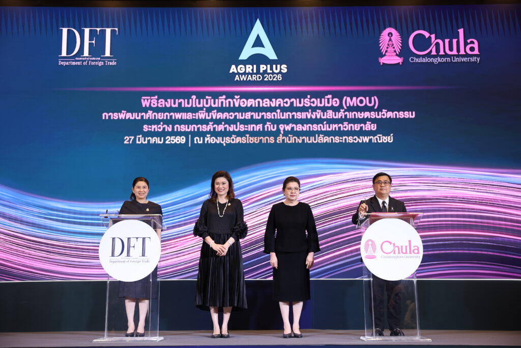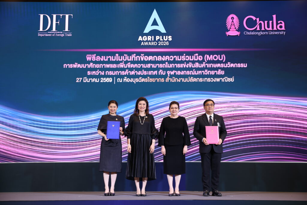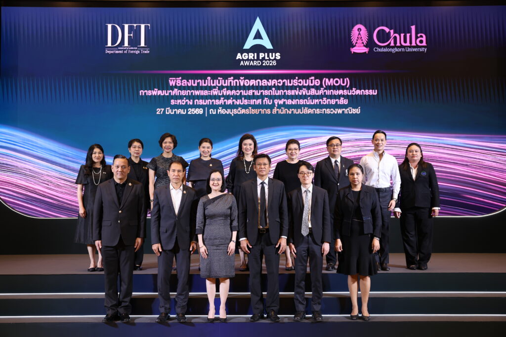 กรมการค้าต่างประเทศ กระทรวงพาณิชย์ เปิดเวทีการประกวด Agri Plus Award 2026 เฟ้นหาสุดยอดสินค้าเกษตรนวัตกรรมไทยสร้างมูลค่าเพิ่มสู่ตลาดโลก ชิงถ้วยพระราชทานอันทรงเกียรติจากสมเด็จพระกนิษฐาธิราชเจ้า กรมสมเด็จพระเทพรัตนราชสุดาฯ สยามบรมราชกุมารี เปิดโอกาสให้เจ้าของผลิตภัณฑ์ นิสิต นักศึกษา นักวิจัย และคนรุ่นใหม่ทั่วประเทศได้โชว์ไอเดีย พลิกโฉมสินค้าเกษตรไทยให้ก้าวไกลระดับสากล โดยในปีนี้ กรมฯ ได้รับเกียรติจากผู้ช่วยรัฐมนตรีประจำกระทรวงพาณิชย์ (ดร. กิริฎา เภาพิจิตร) ให้เกียรติมาเป็นประธานในพิธี และเป็นสักขีพยานในการลงนาม MOU ระหว่างกรมการค้าต่างประเทศและจุฬาลงกรณ์มหาวิทยาลัย ร่วมปั้น SMEs สินค้าเกษตรนวัตกรรมไทย ก้าวไกลสู่อินเตอร์